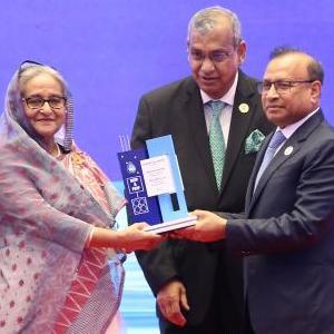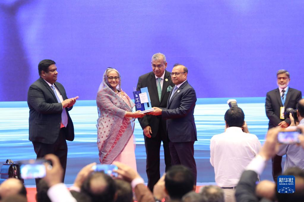 7月13日,孟加拉国总理哈西娜(左二)与孟加拉国地方政府、农村发展和合作社部部长塔兹(左四)等在达卡出席竣工典礼。