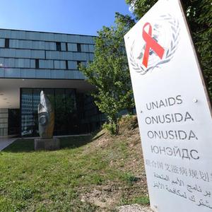 这是7月13日在瑞士日内瓦联合国艾滋病规划署总部拍摄的联合国艾滋病规划署(左)和世界卫生组织标识。
