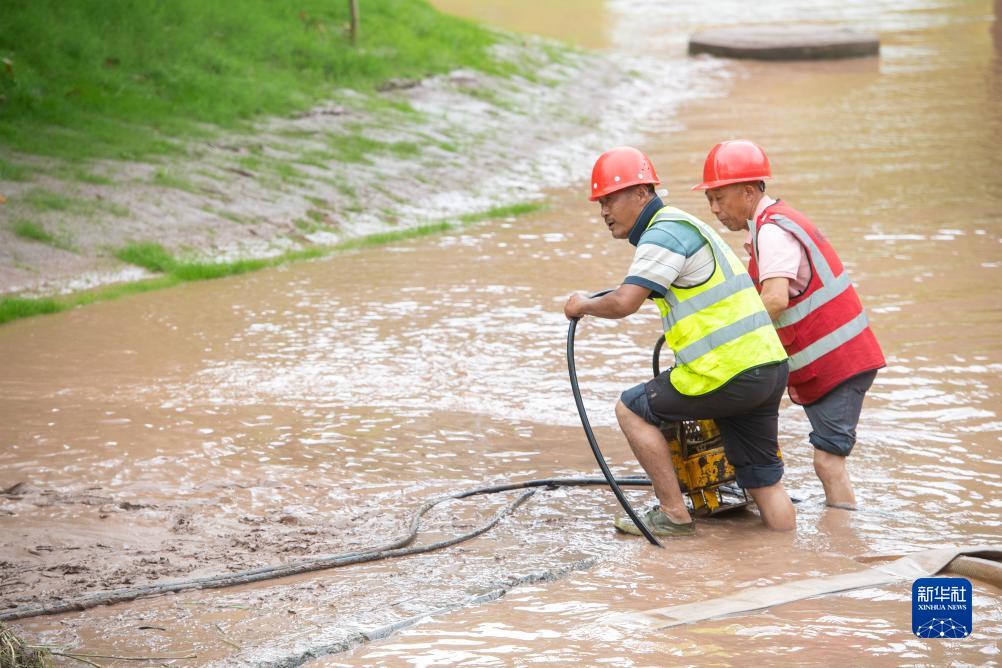 7月14日,在重庆市万州区江南新区,救援人员进行排水抢险作业。