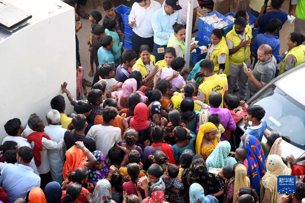 7月13日,在印度新德里,生活受到水灾影响的居民领取生活物资。