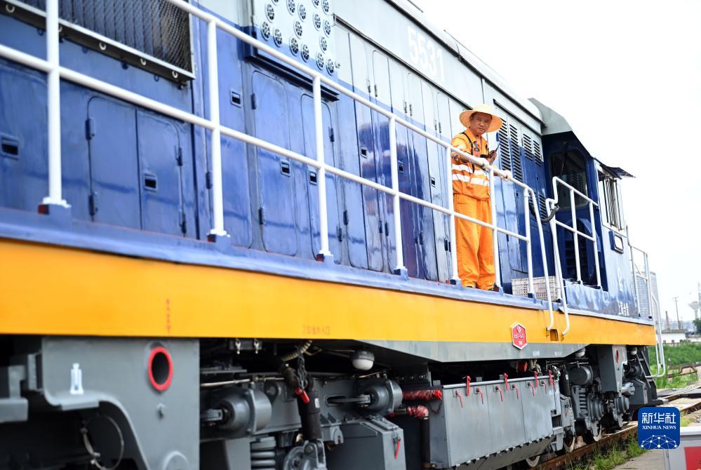 7月13日,合肥火车站运转车间调车长崔中虎在指挥调车作业。