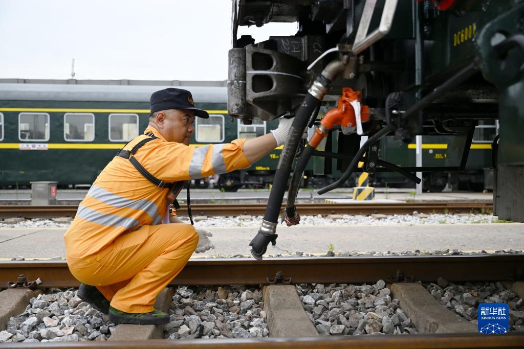 7月13日,合肥火车站运转车间调车长李健在调试车辆制动软管。