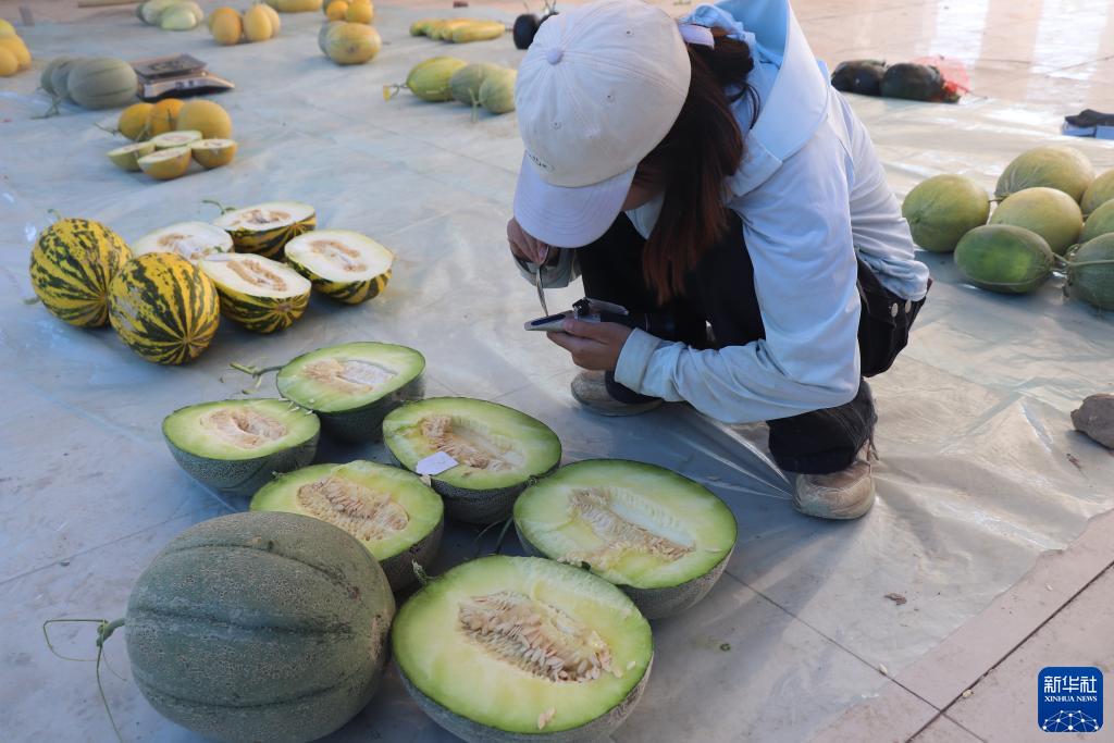 7月14日,工作人员在进行甜瓜果肉糖度数据采集。