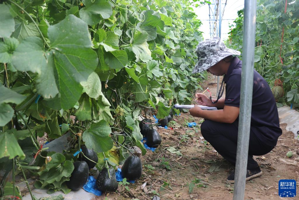 7月14日,科研人员在进行甜瓜资源田间数据调查。