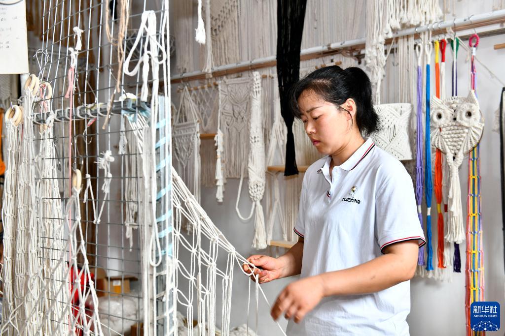 7月14日,在惠民县姜楼镇史官庄堡村,村民在编织绳网工艺产品。