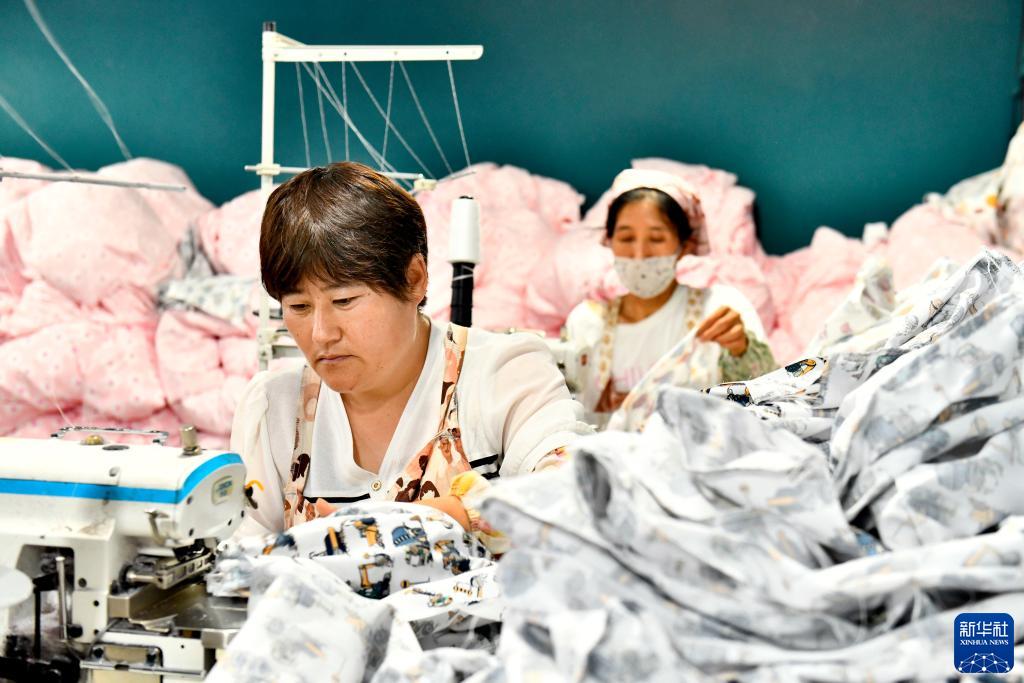 7月14日,在惠民县胡集镇河东村,村民在加工床笠。