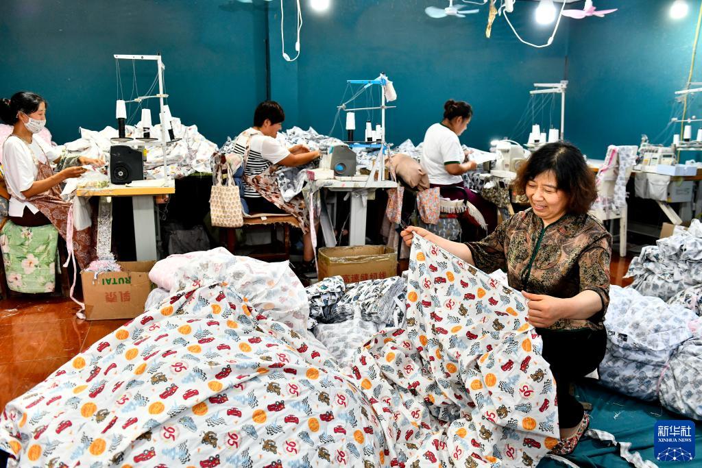 7月14日,在惠民县胡集镇河东村,村民在加工床笠。