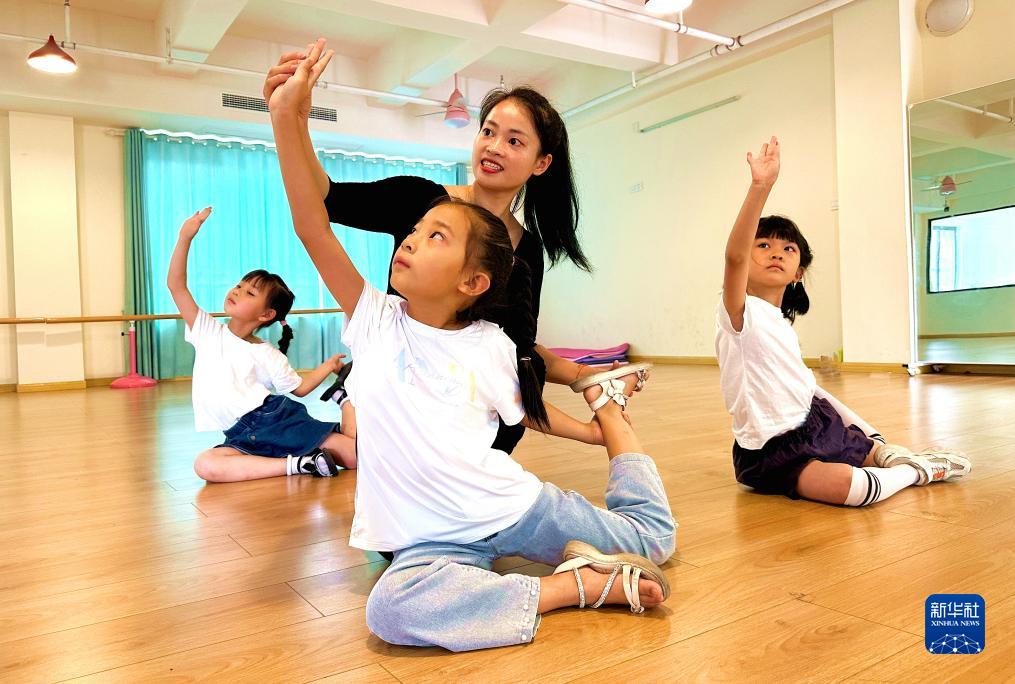 7月14日,在四川省眉山市仁寿县一家舞蹈室,孩子们在老师的指导下练习舞蹈基本功。