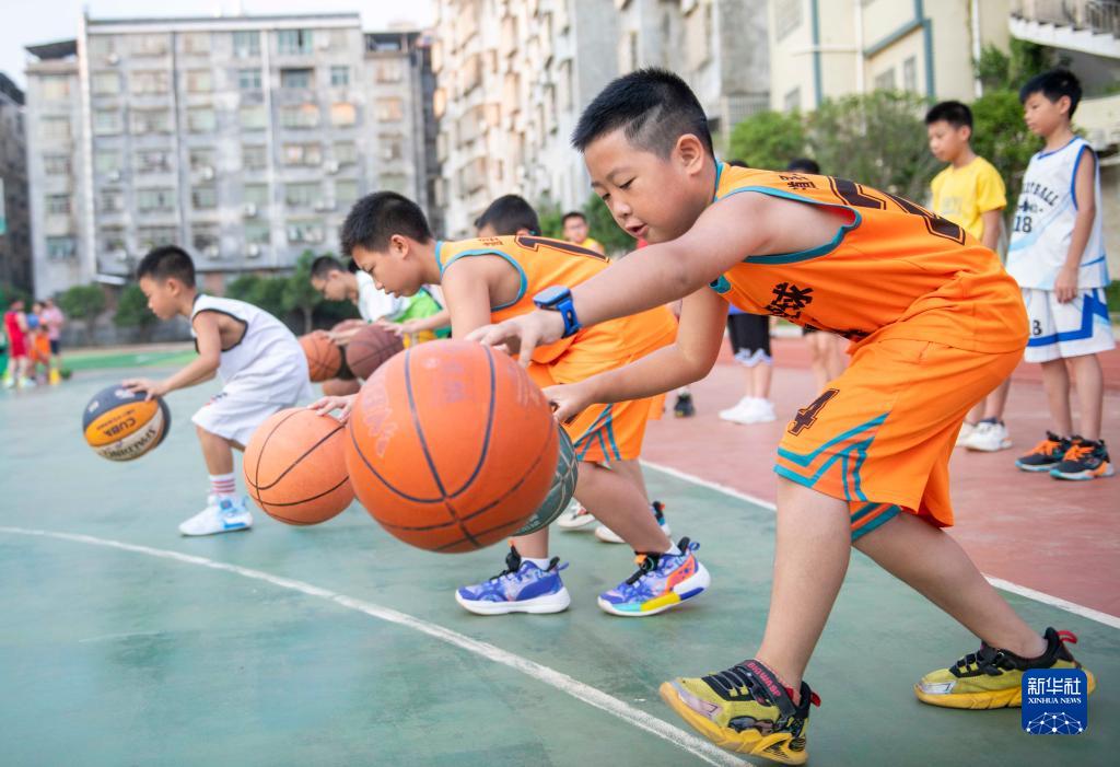 7月14日,在湖南省永州市道县树湘学校运动场,孩子们参加篮球训练。