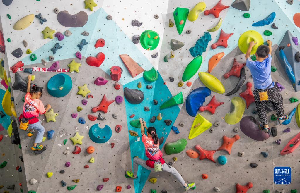7月14日,孩子们在重庆市南川区一家攀岩训练馆里练习攀岩。