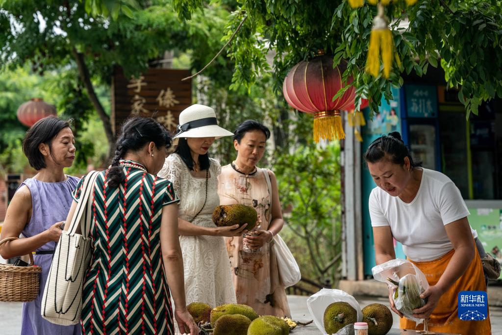 7月14日,游客在云南省德宏傣族景颇族自治州芒市风平镇帕底村介桃村民小组购买菠萝蜜。