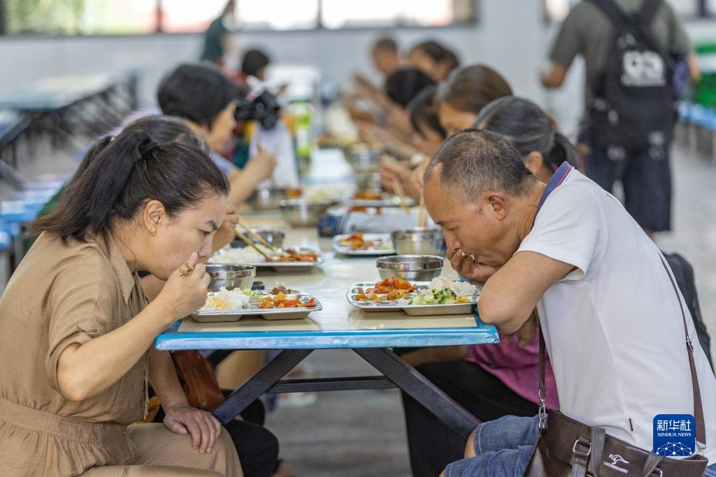 7月14日,在重庆市万州三中江南校区临时安置点内,转移安置人员在就餐。