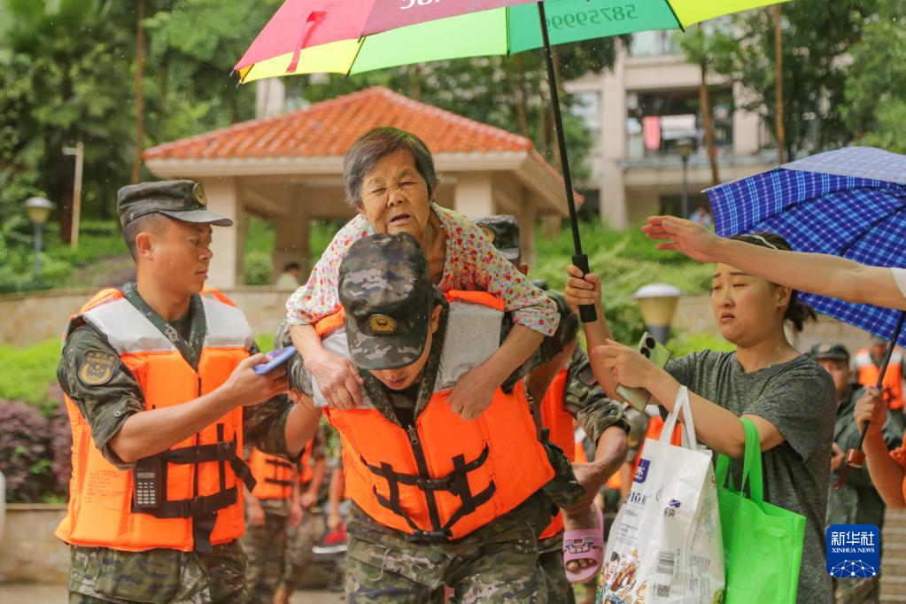 7月14日,在重庆市万州区江南新区,武警重庆总队执勤第三支队官兵在转移群众。