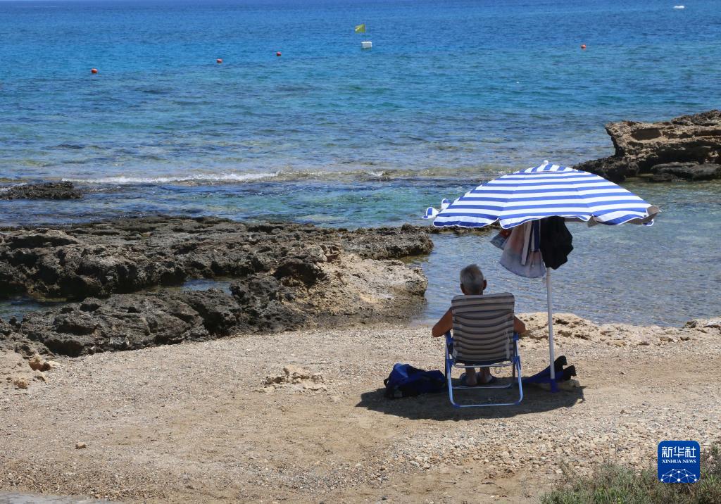 7月14日,一名老人在塞浦路斯普罗塔拉斯的一处海滩消暑。新华社记者 郭明芳 摄