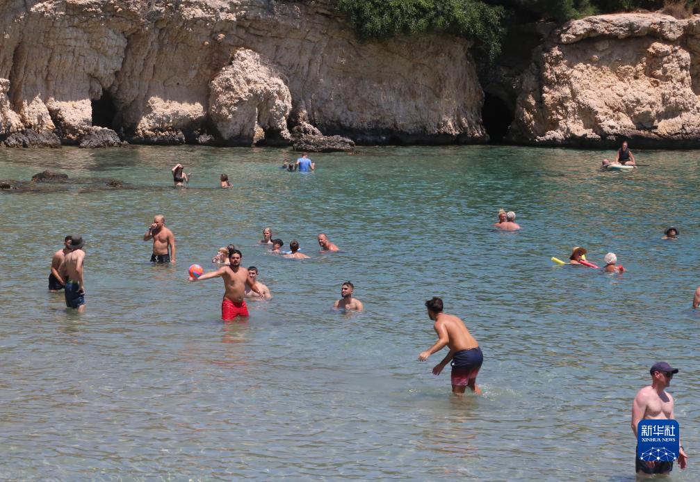 7月14日,人们在塞浦路斯普罗塔拉斯的海边消暑。新华社记者 郭明芳 摄