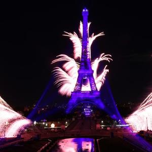 7月14日,焰火在法国巴黎埃菲尔铁塔周围绽放。