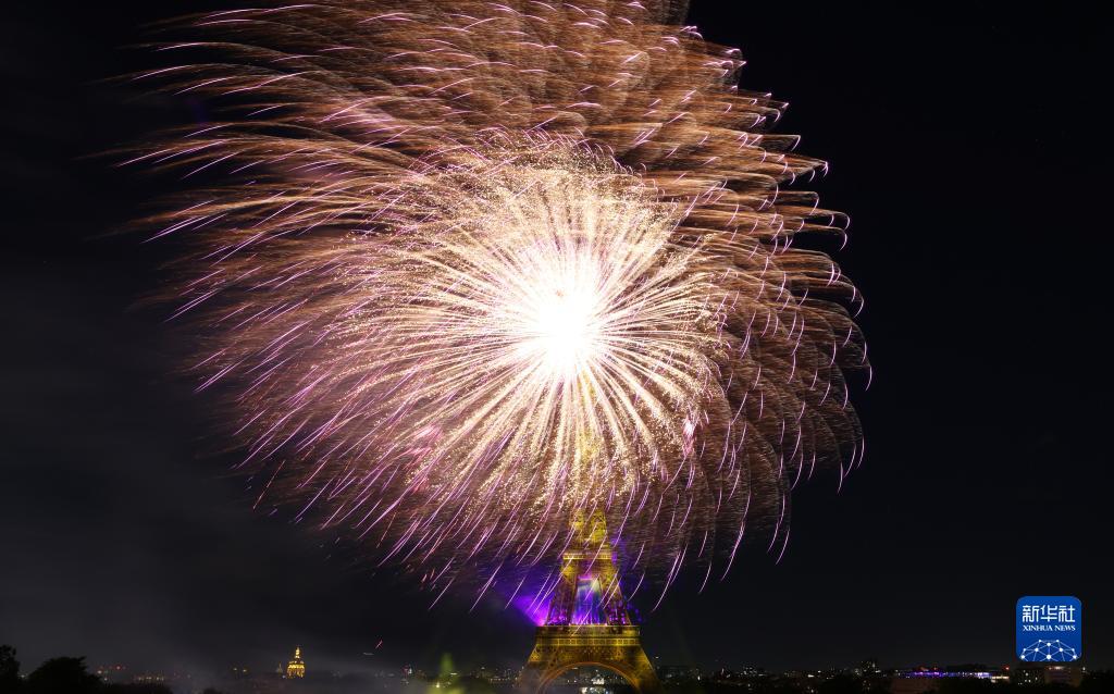 7月14日,焰火在法国巴黎埃菲尔铁塔周围绽放。