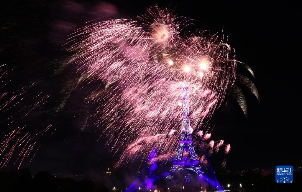 7月14日,焰火在法国巴黎埃菲尔铁塔周围绽放。