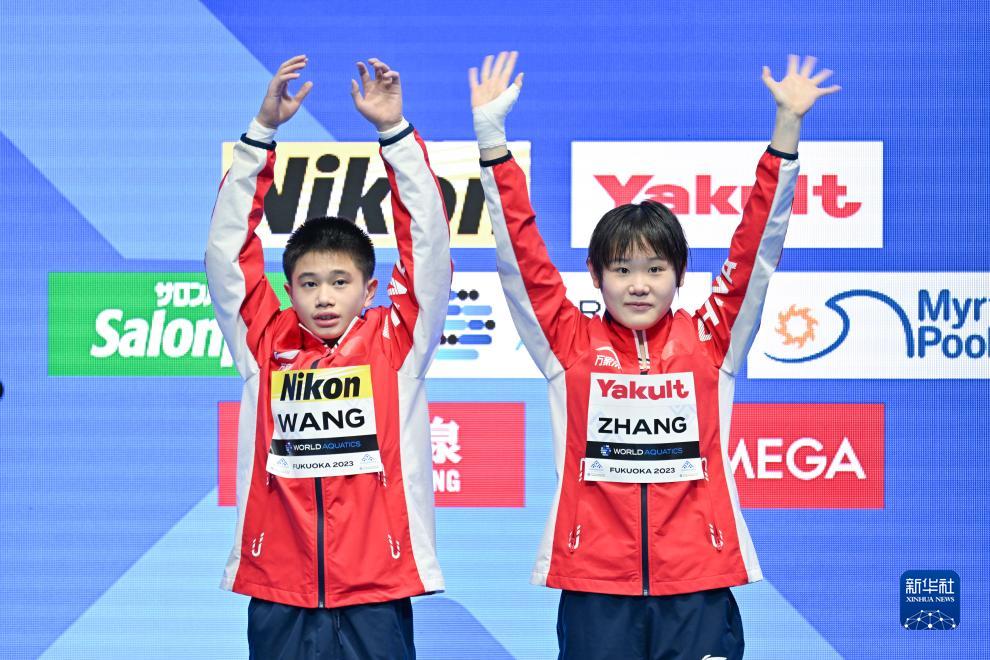 当日,在2023年福冈世界游泳锦标赛跳水混双10米台决赛中,中国组合王飞龙/张家齐以总分339.54分的成绩夺得冠军。