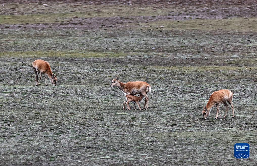 7月8日,在新疆阿尔金山国家级自然保护区兔子湖地区,藏羚羊妈妈给幼崽喂奶。