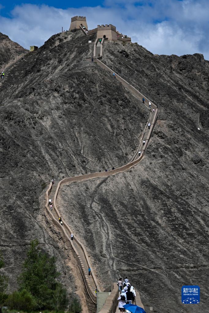 游客在甘肃省嘉峪关市游览悬壁长城(7月13日摄)。