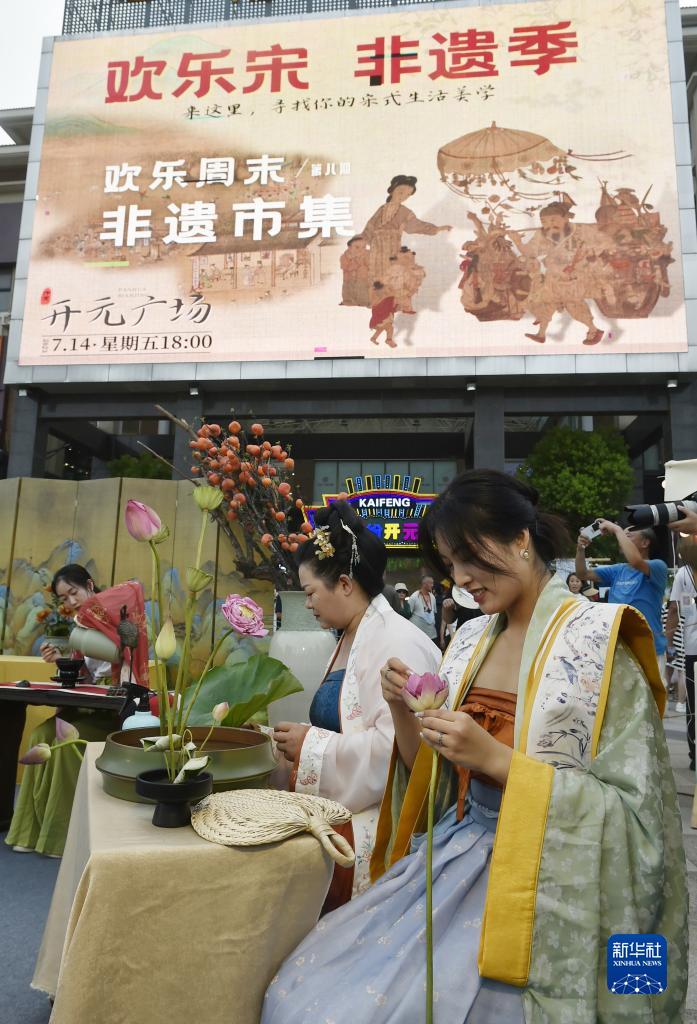 7月14日傍晚,工作人员在开封市开元广场设立的“非遗市集”现场展示插花技艺。