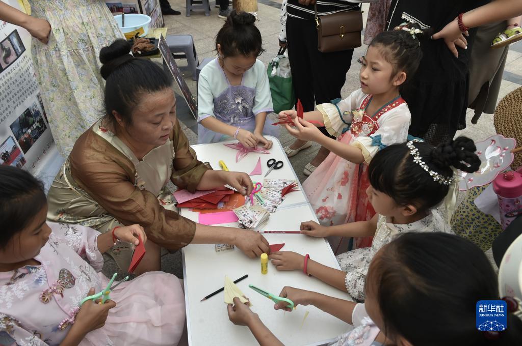 7月14日傍晚,小朋友在开封市开元广场设立的“非遗市集”现场体验剪纸技艺。