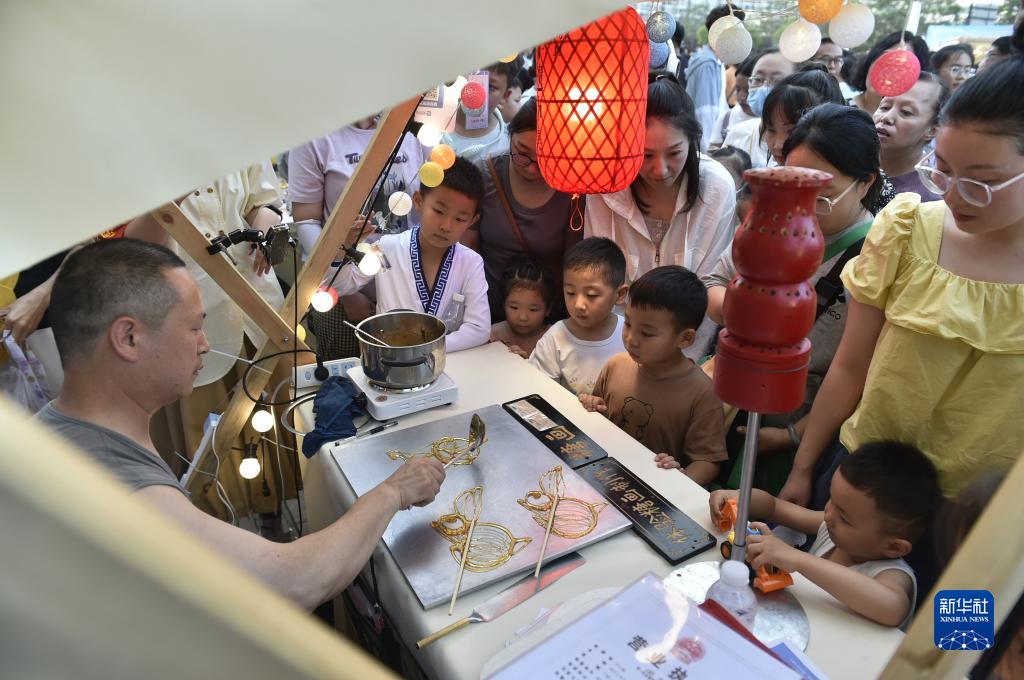 7月14日傍晚,工作人员在开封市开元广场设立的“非遗市集”现场展示糖画制作技艺。