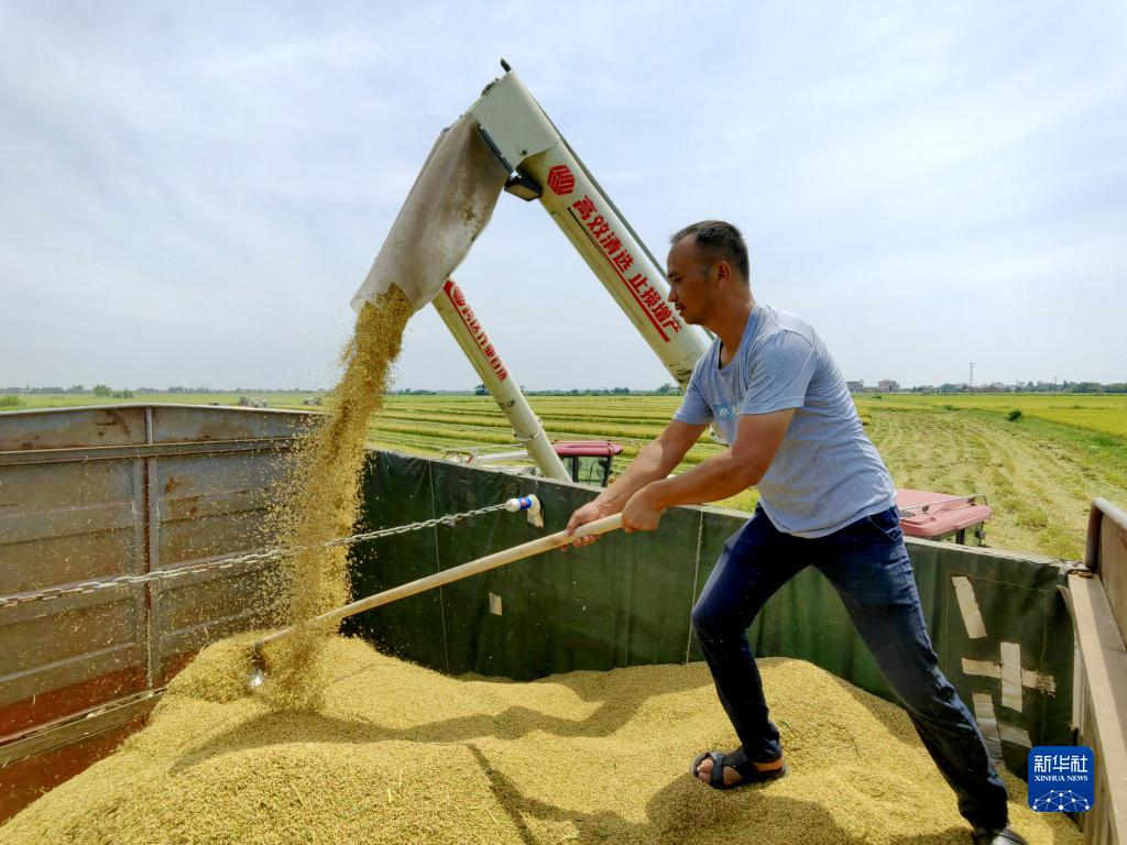 在江西省南昌县塘南镇北联村,收割机将稻谷转运至装谷车内(7月13日摄)。