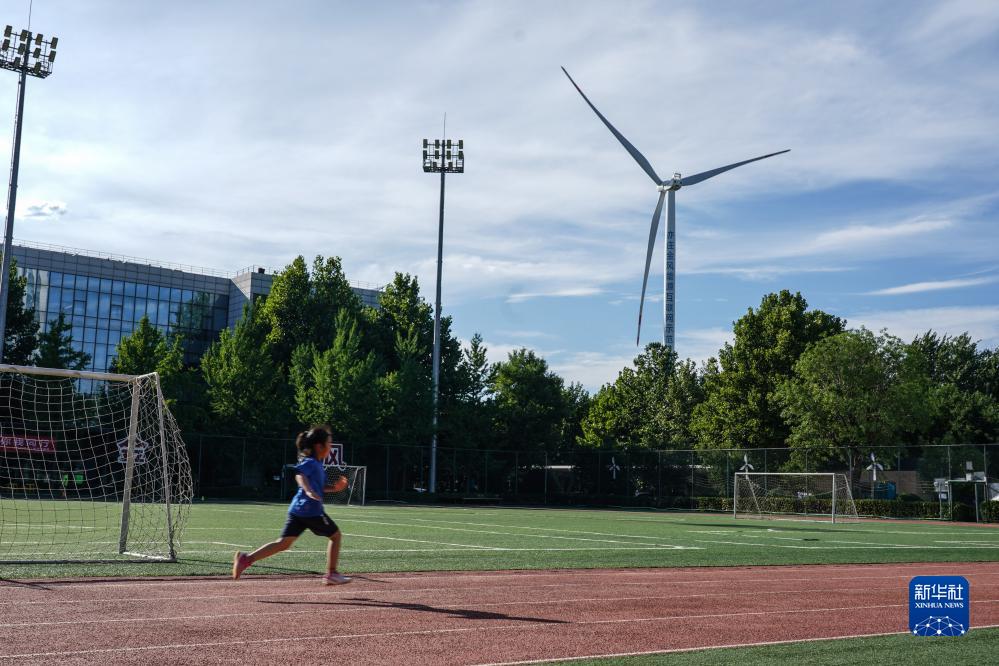 7月14日,小女孩在园区操场上跑步,远处是风力发电设备。