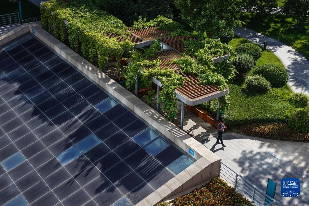 7月14日,一名工作人员在花园散步,旁边是园区的光伏设备。