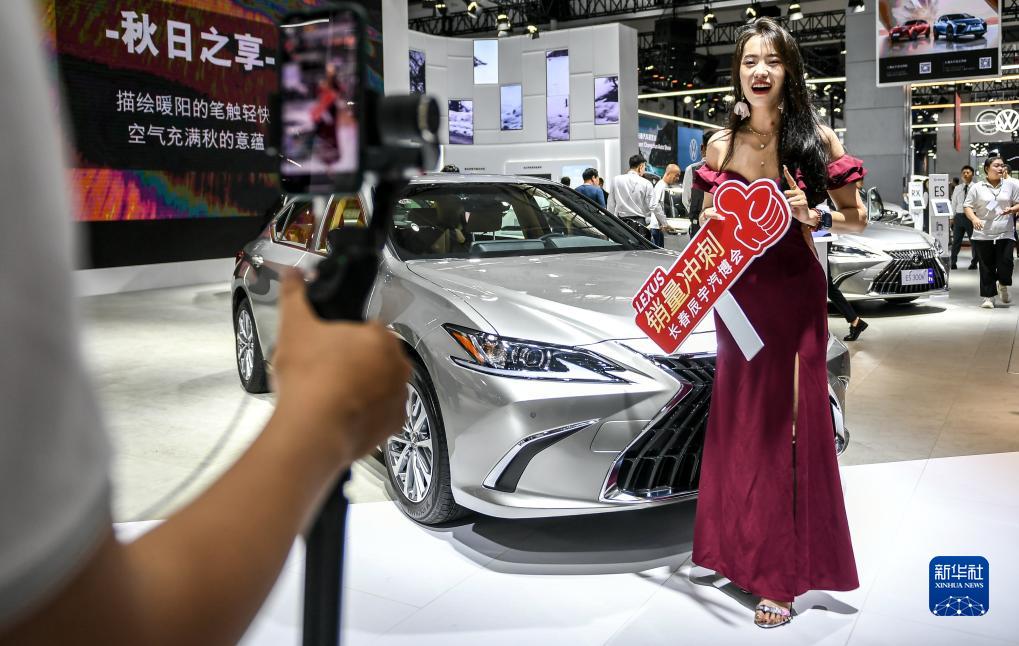 7月15日,一名工作人员在长春汽博会现场录制短视频。