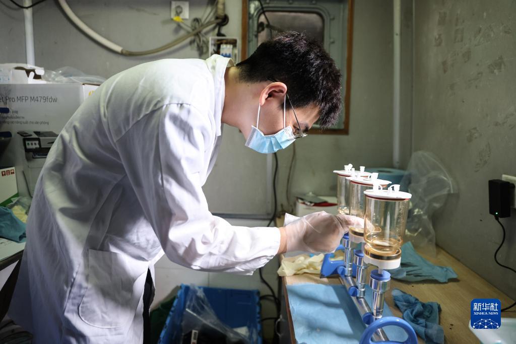 6月30日,第六次南海深潜及远海鲸类科考航次的科研人员在进行水样过滤。