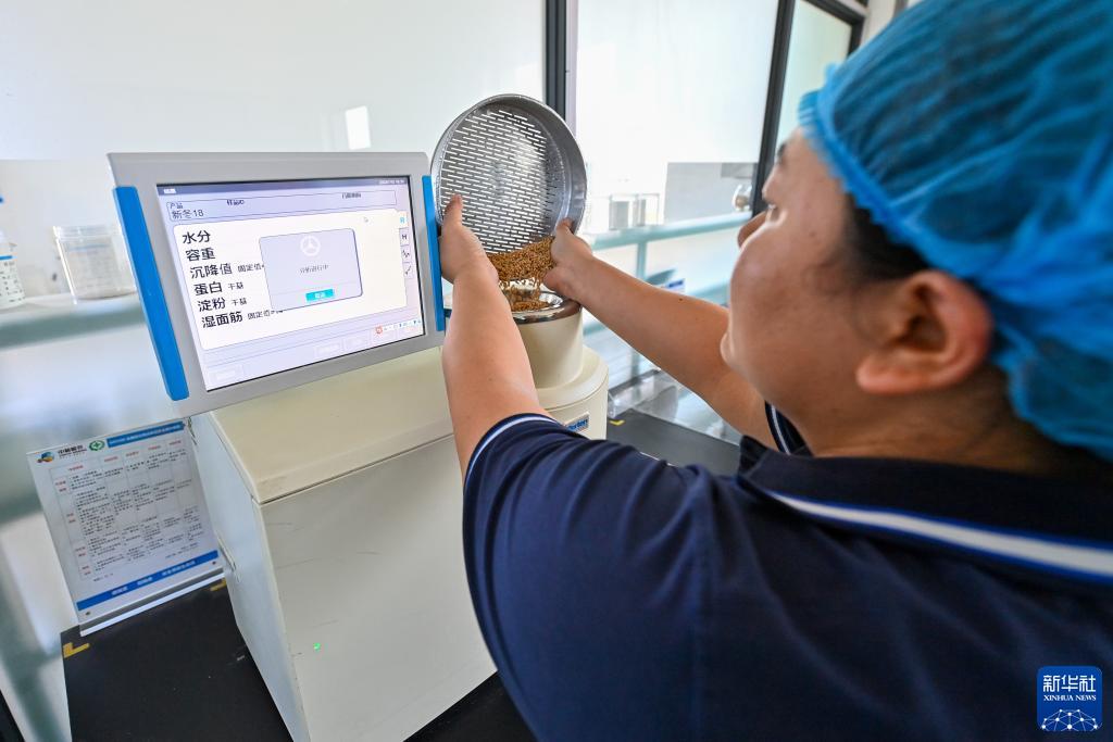 新疆呼图壁县一家粮食收购企业的工作人员对交售的小麦进行检测(7月15日摄)。