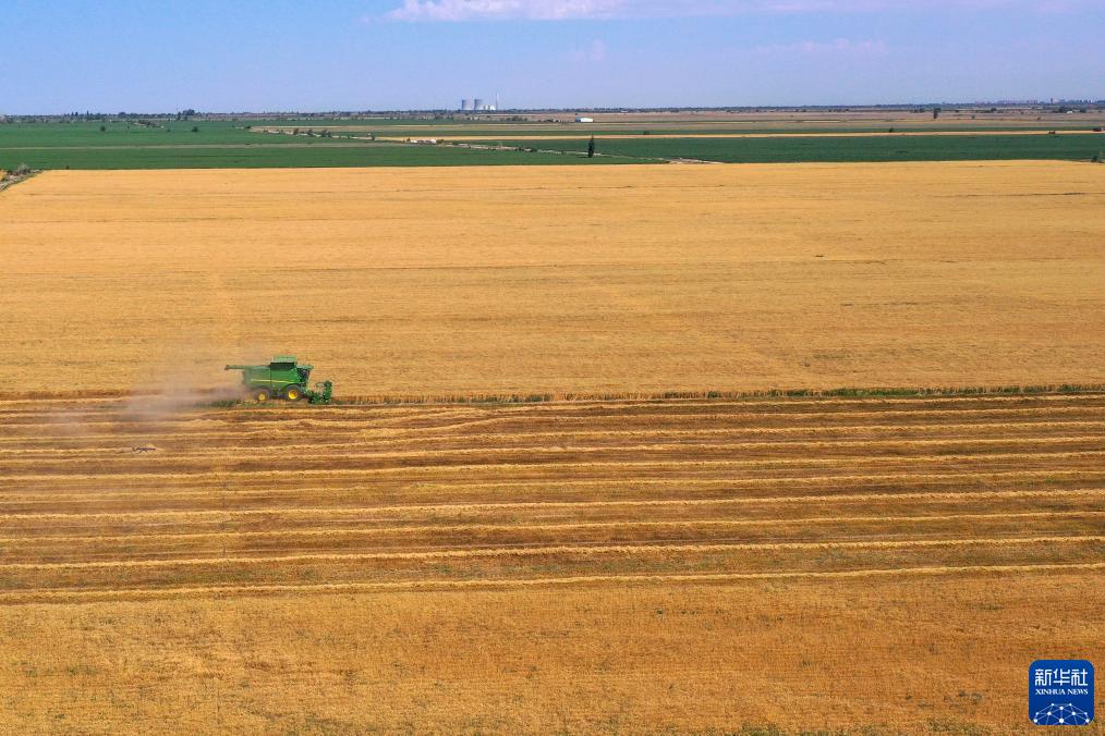 农机手驾驶联合收割机在新疆呼图壁县二十里店镇宁州户村收割小麦(7月15日摄,无人机照片)。