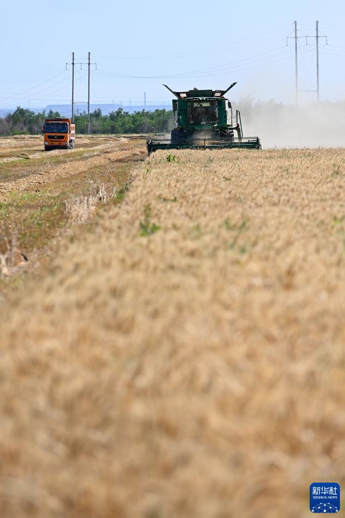 农机手驾驶联合收割机在新疆呼图壁县二十里店镇宁州户村收割小麦(7月15日摄)。