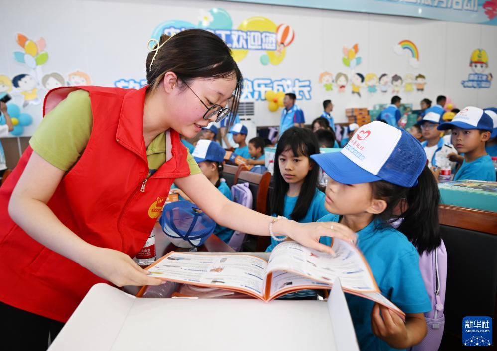 7月15日,在山东青岛中铁建工上合大厦项目部“小候鸟”驿站,志愿者在给孩子们上课。