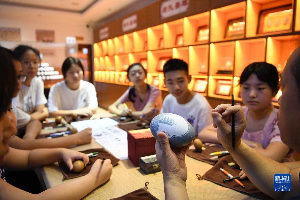 7月15日,学生在河北省涿州市蒲氏蛋雕非遗传承馆内学习蛋雕制作技艺。