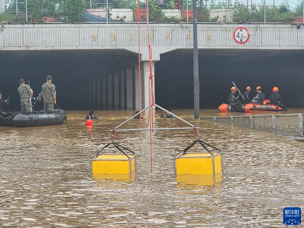 7月16日,在韩国忠清北道清州市,救援人员在被水淹没的地下车道进行搜救工作。