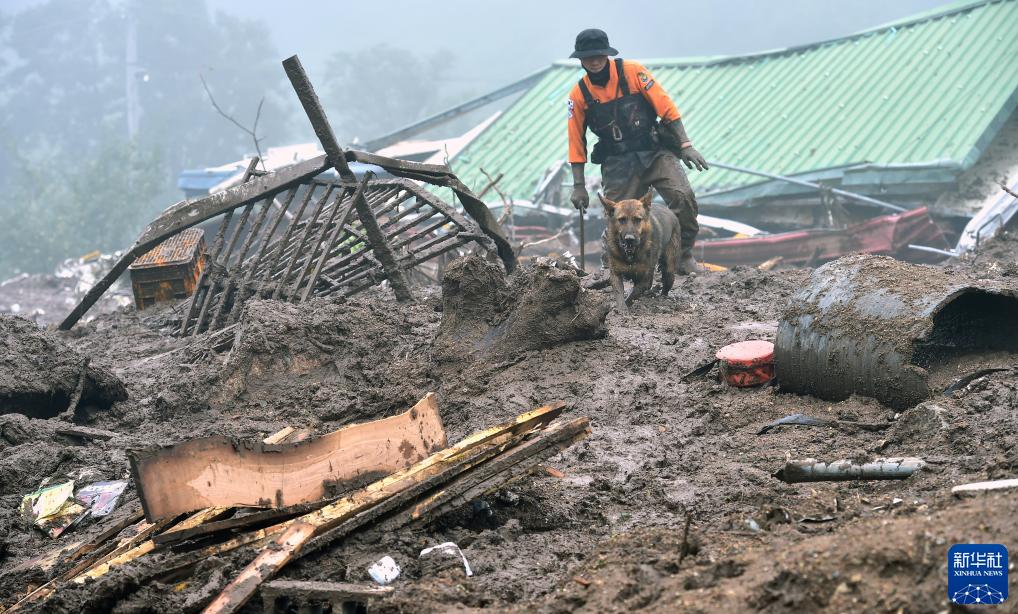 7月16日,在韩国庆尚北道醴泉郡,救援人员在因暴雨引发山体滑坡的村庄内搜救。
