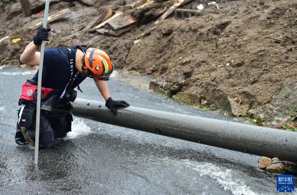 7月16日,在韩国庆尚北道醴泉郡,一名救援人员在搜救中途短暂休整。