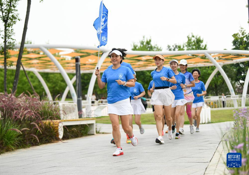 在成都市龙泉驿区东安湖体育公园,杜以萍(前)带领跑团成员跑步(7月12日摄)。