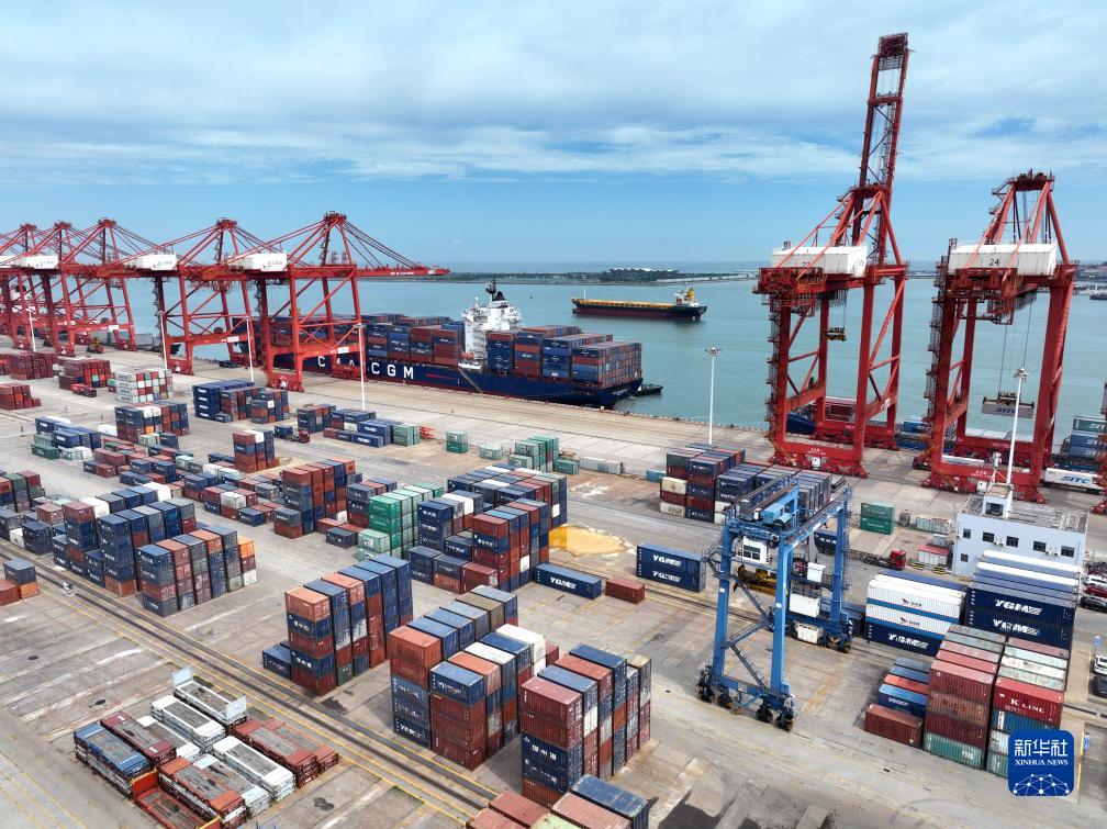 7月16日,货轮在江苏连云港港集装箱码头泊位上装卸集装箱(无人机照片)。
