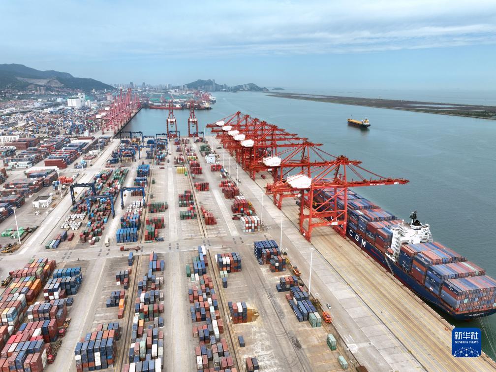 7月16日,货轮在江苏连云港港集装箱码头泊位上装卸集装箱(无人机照片)。