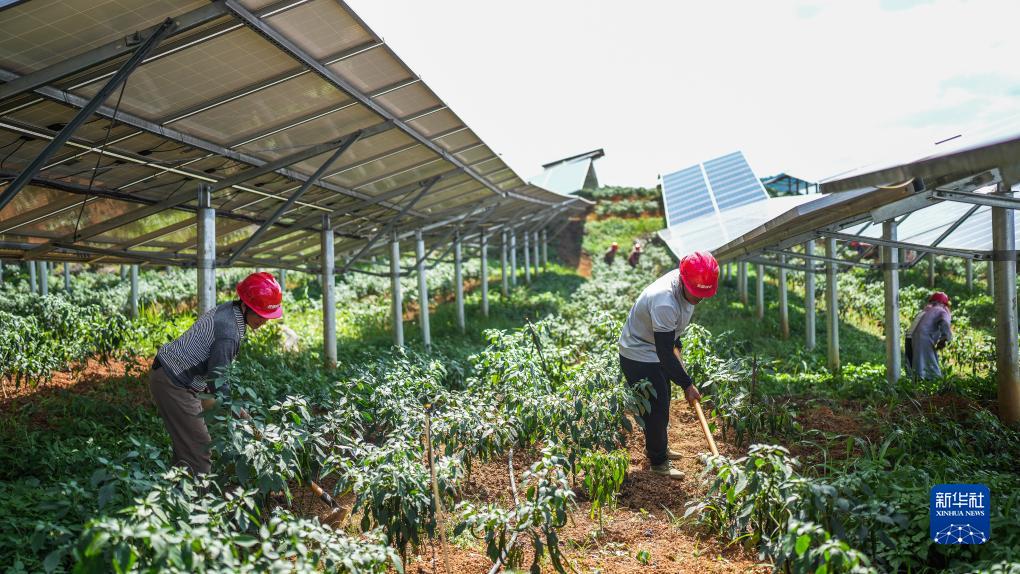 村民在贵州金元木科农业光伏电站光伏板下的土地种植辣椒(7月5日摄)。
