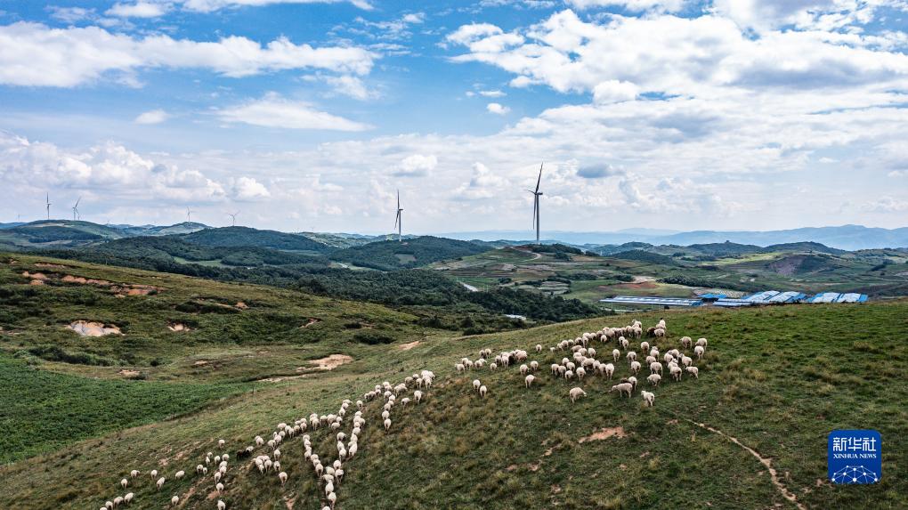 威宁彝族回族苗族自治县雪山镇村民养的羊群在风力发电设备下的草场吃草(7月13日摄,无人机照片)。