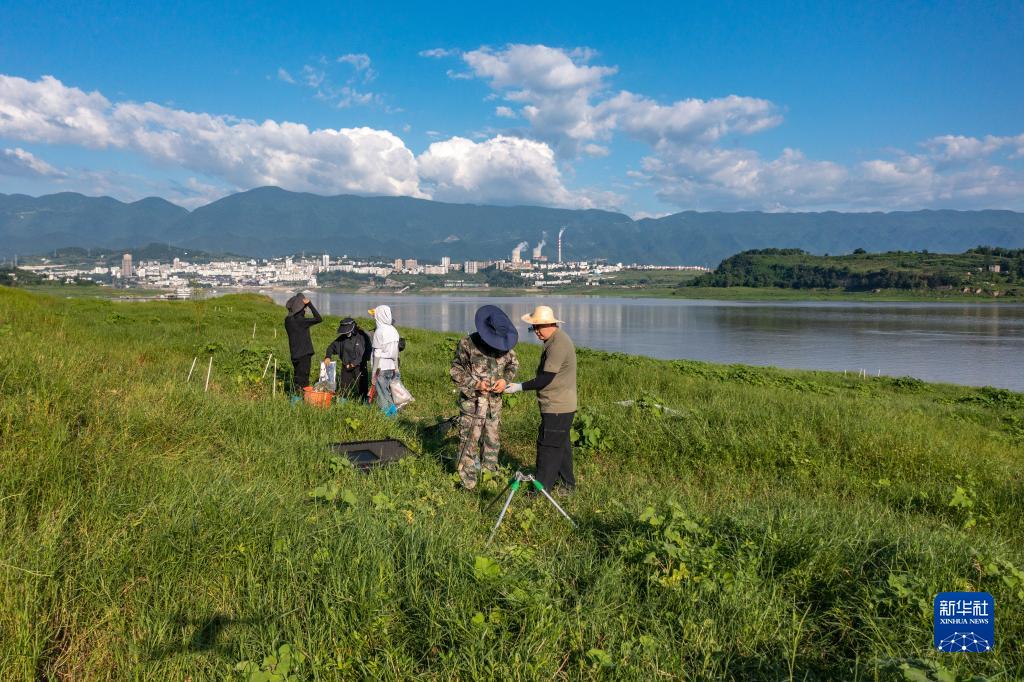 在中国科学院三峡库区水土保持与环境研究站,中国科学院成都山地所科研人员在库区消落带上开展相关监测(7月5日摄,无人机照片)。