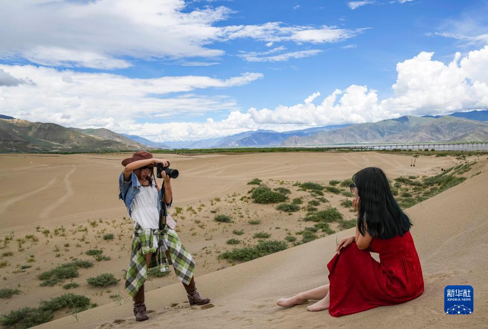 在扎囊沙漠公园,游客拍照留念(7月16日摄)。