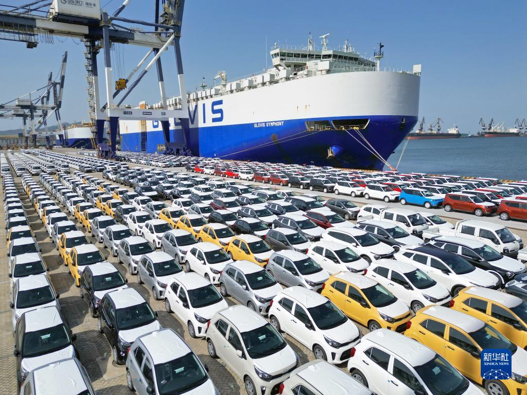 大批出口商品车集结山东港口烟台港准备通过汽车滚装船发运(7月5日摄,无人机照片)。