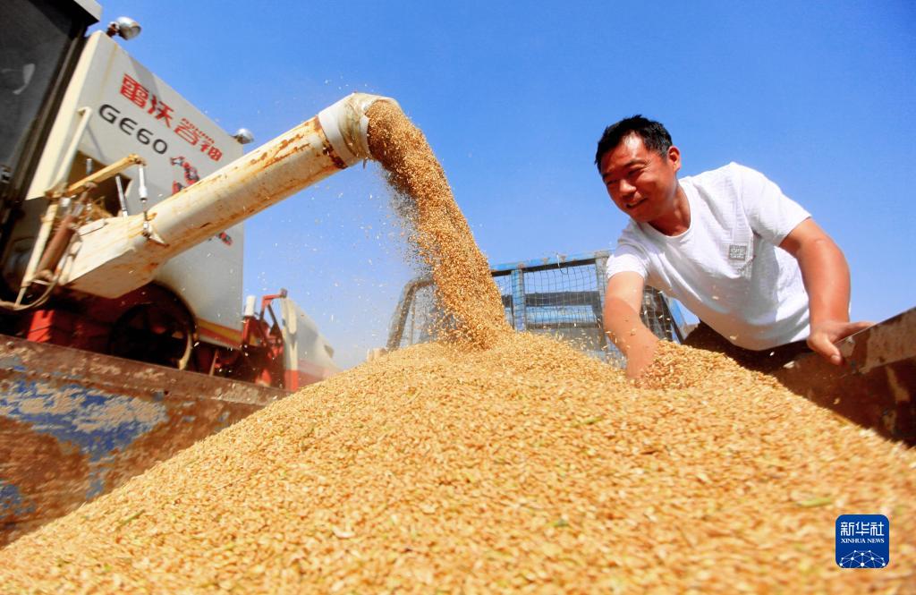 山东省临沂市平邑县地方镇农民将收获的小麦装车(6月13日摄)。